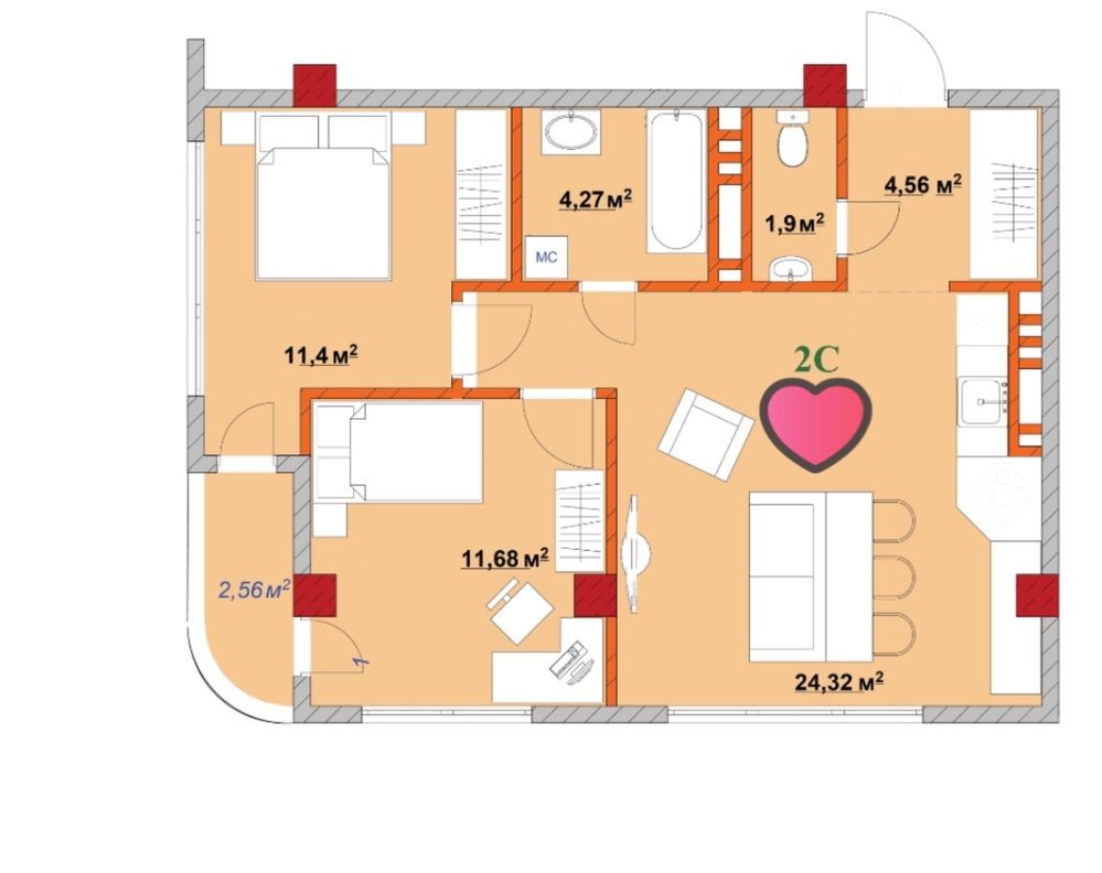 • Площадь кухни 24.32 м2