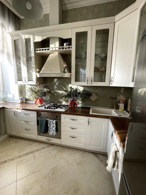 Якісна, ергономічна, всім оснащена кухня, продумана до дрібниць. Газова варильна поверхня Freggia на 5 комфорок, посудомийна машина, подрібнювач харчових відходів InSinkErator (США) вбудований в мийку, духова шафа, холодильик.