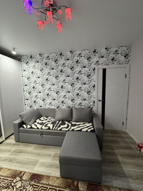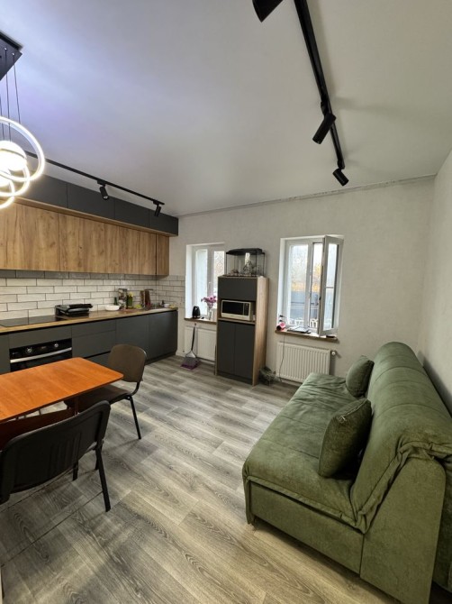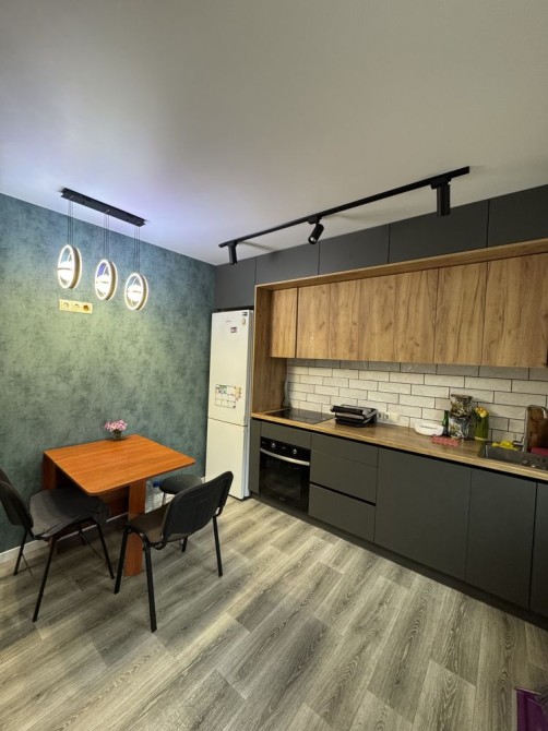 Простора кухня з новими меблями та технікою, світла кімната з шафою-купе, сучасний санвузол.