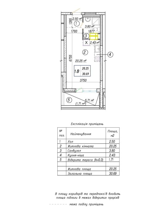 Загальна площа квартири становить 30,69 квадратних метра.