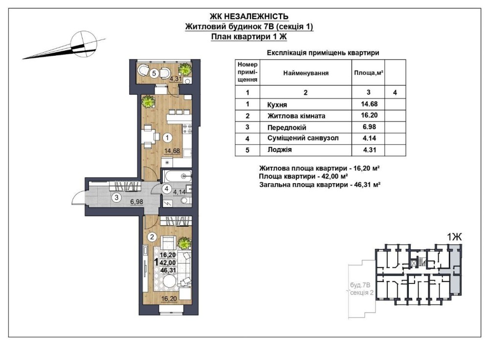 Загальна площа 46.3м2.