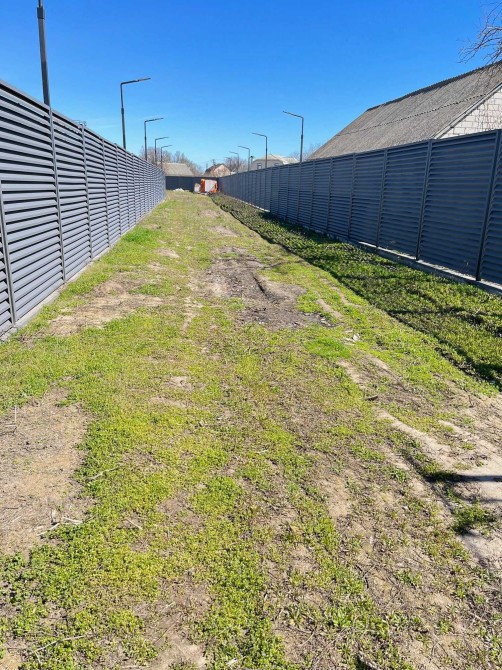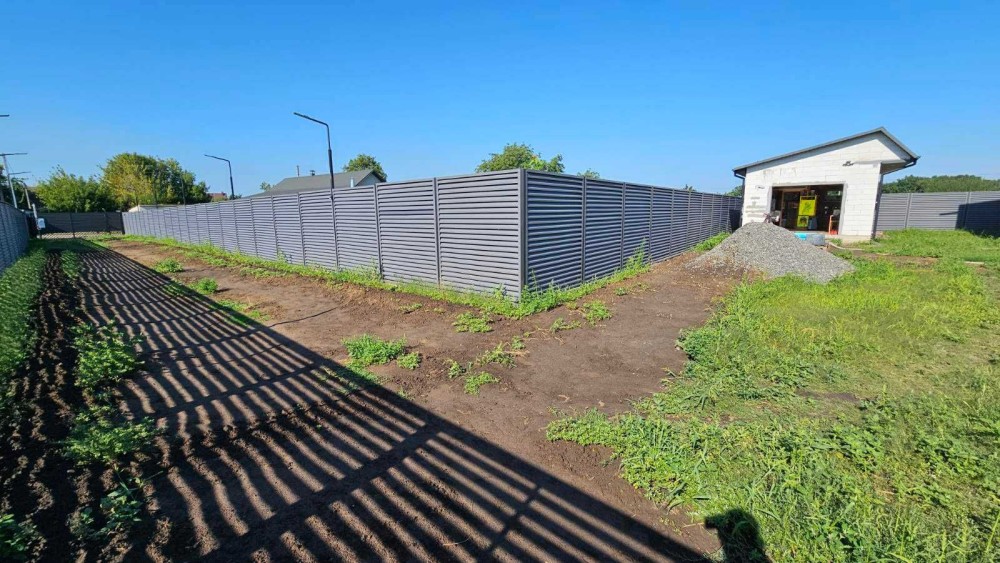 Ділянка 14 соток, по периметру якої зроблено капітальний вентильований забор "Жалюзі", довжиною майже 200 метрів та висотою 2,40 м., на металічних стовбчиках та стрічковому фундаменті