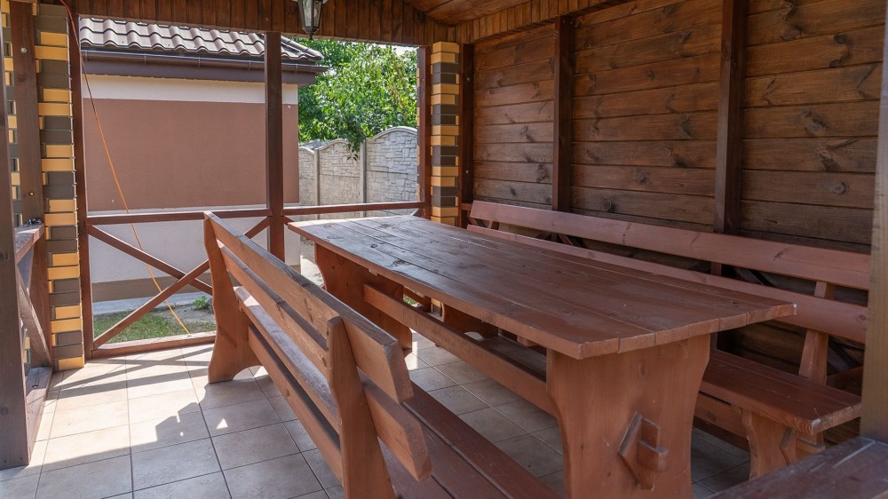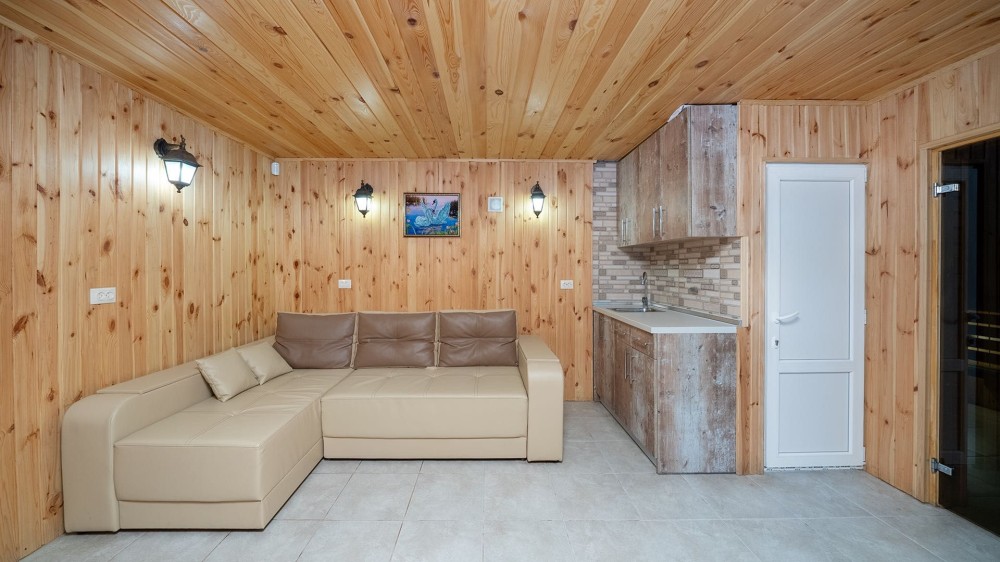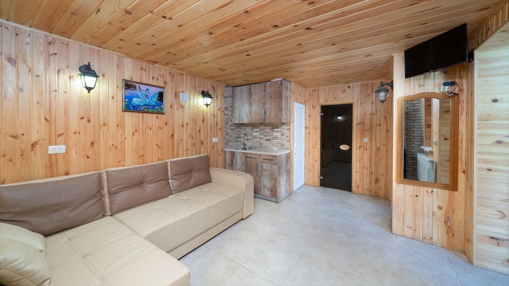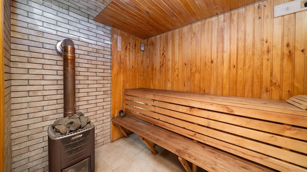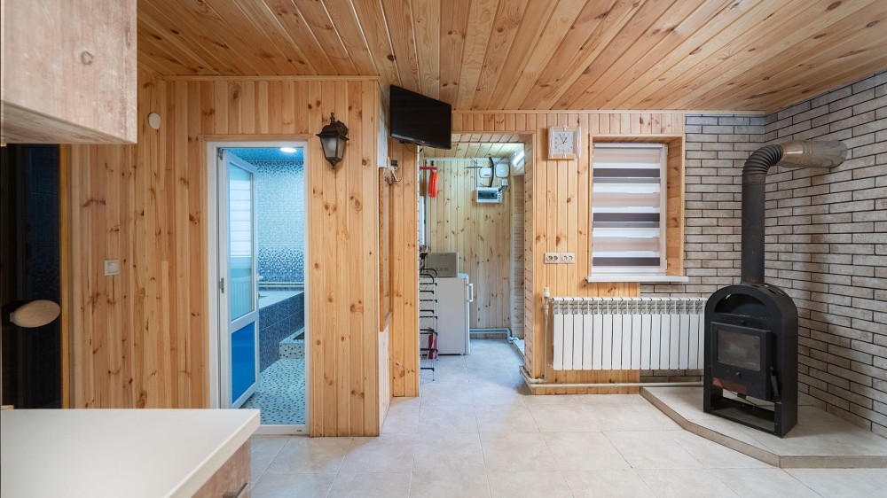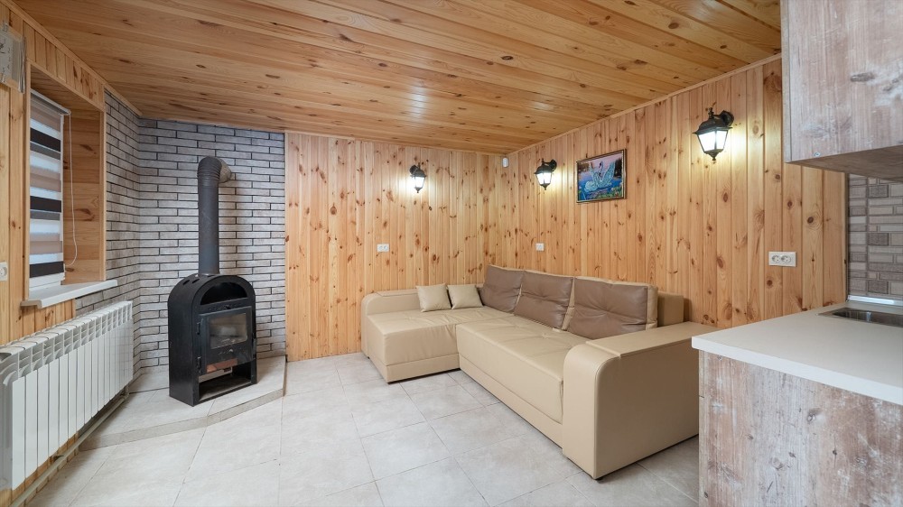 • Сауна: фінська топка HARVIA, димохід сендвіч, утеплена парна (базальтова камʼяна вата + фольга), обшивка вагонкою з липи, лежаки з вільхи.