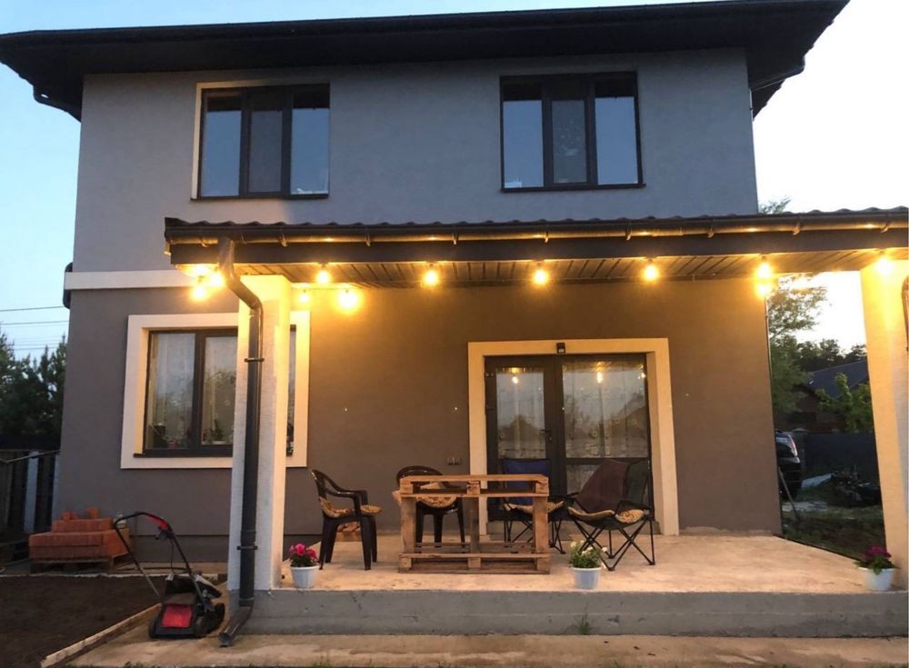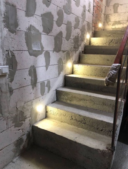 Коридор + сходи бетонні наливні на другий поверх, зроблені прохідні вимикачі + освітлення сходів. Світло + розетки. Тераса – виведено електрику, зроблено вечірнє освітлення (улюблене місце для всієї родини влітку). Перед терасою вирівняний ландшафт посаджений газон + квіти та два фініки, поряд підготовлена зона барбекю з виведенням води та мангал.