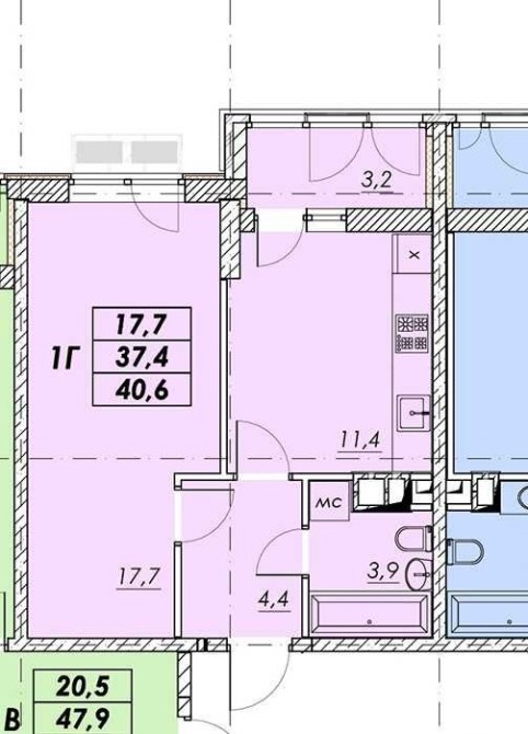 • Общая площадь 40.6 м2