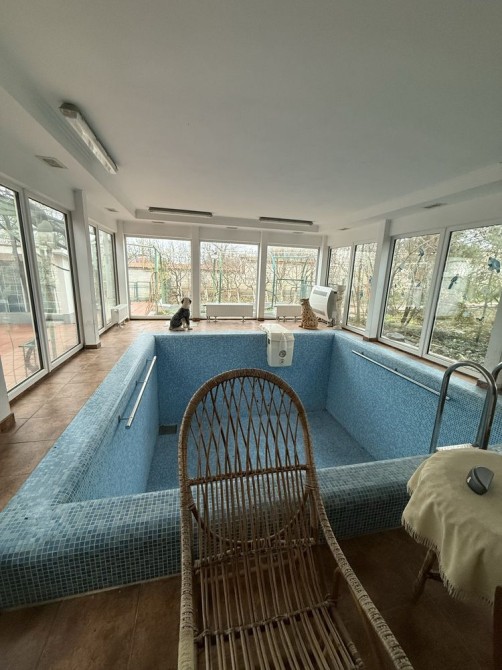 При входе в дом крытый стационарный бассейн, глубина 2м, сауна и душевая.