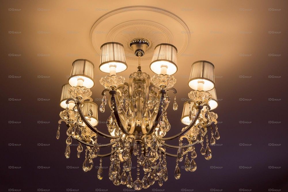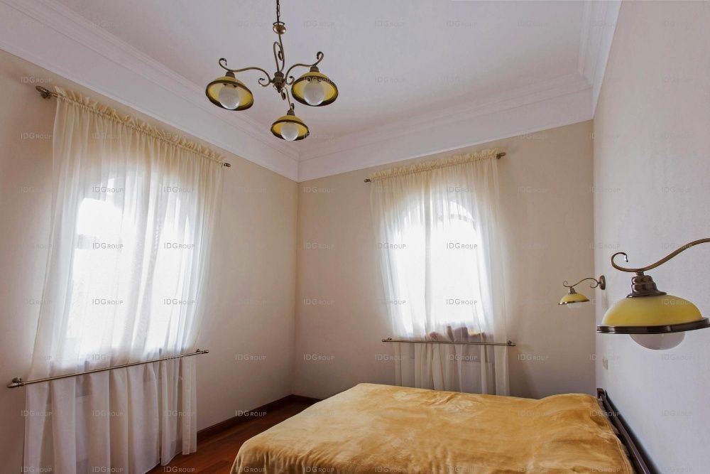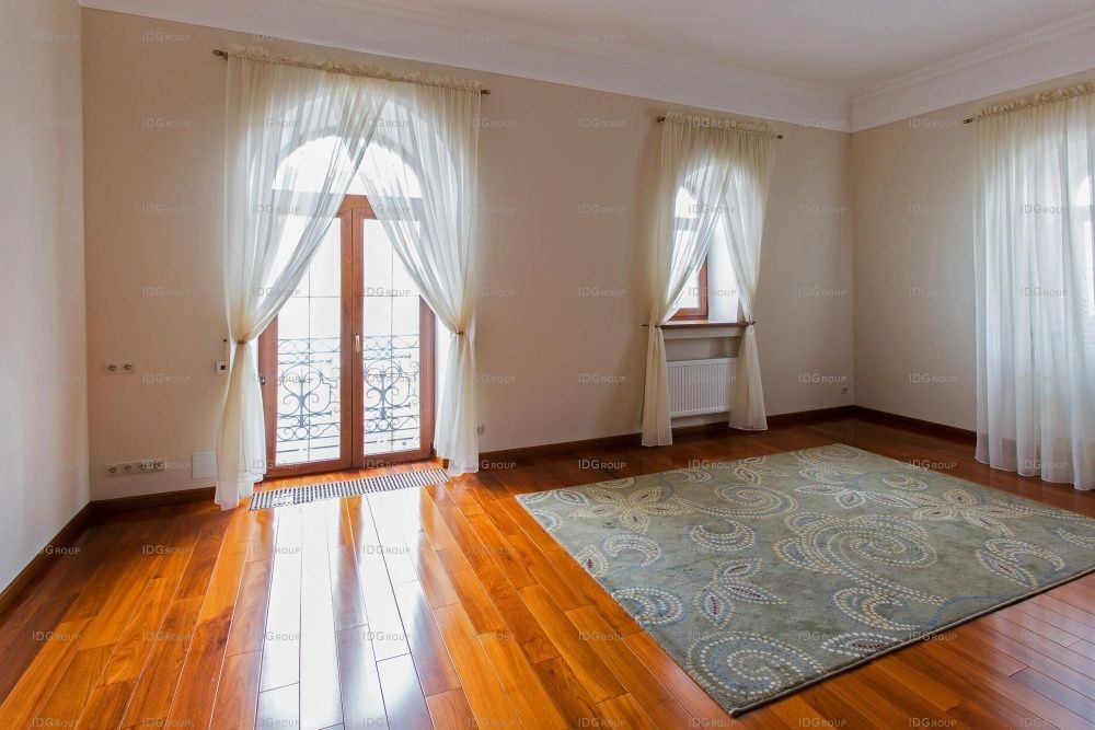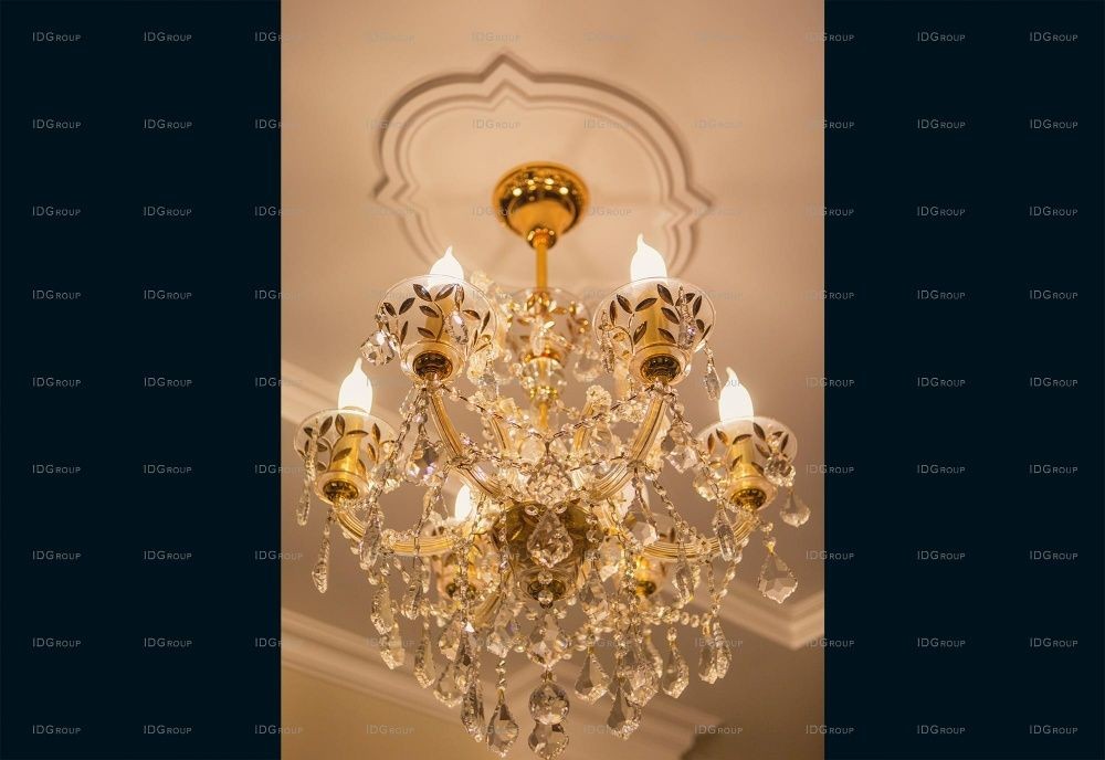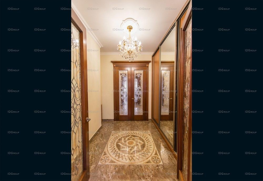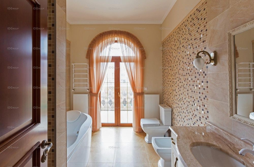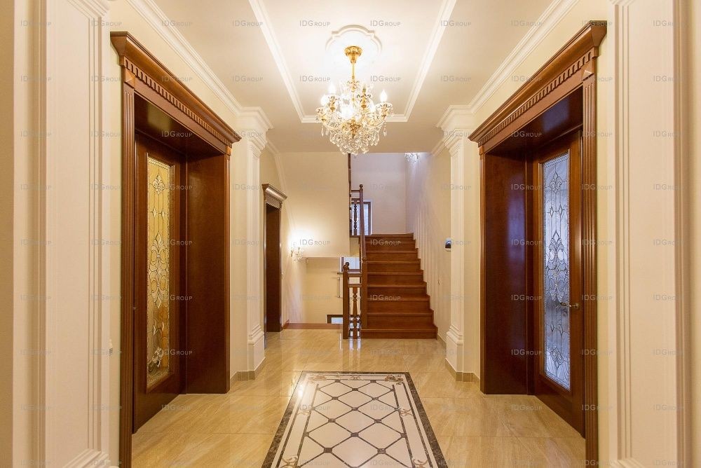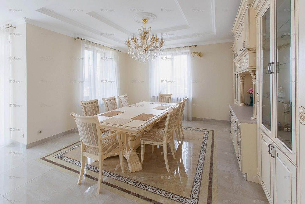 На всем первом этаже полы облицованы мрамором с различными узорами и орнаментами – это создает в помещениях атмосферу роскоши и придает особый блеск. Традиционно для классического интерьера, в декоре используются разноуровневые белоснежные потолки с лепниной и рифлеными карнизами и лепные розетки на потолке. Все помещения наполнены воздухом и светом – такой интерьер излучает покой и настраивает на отдых.