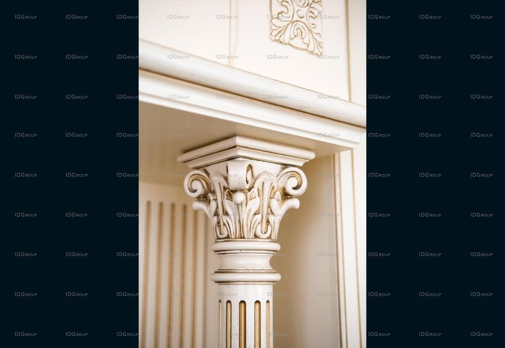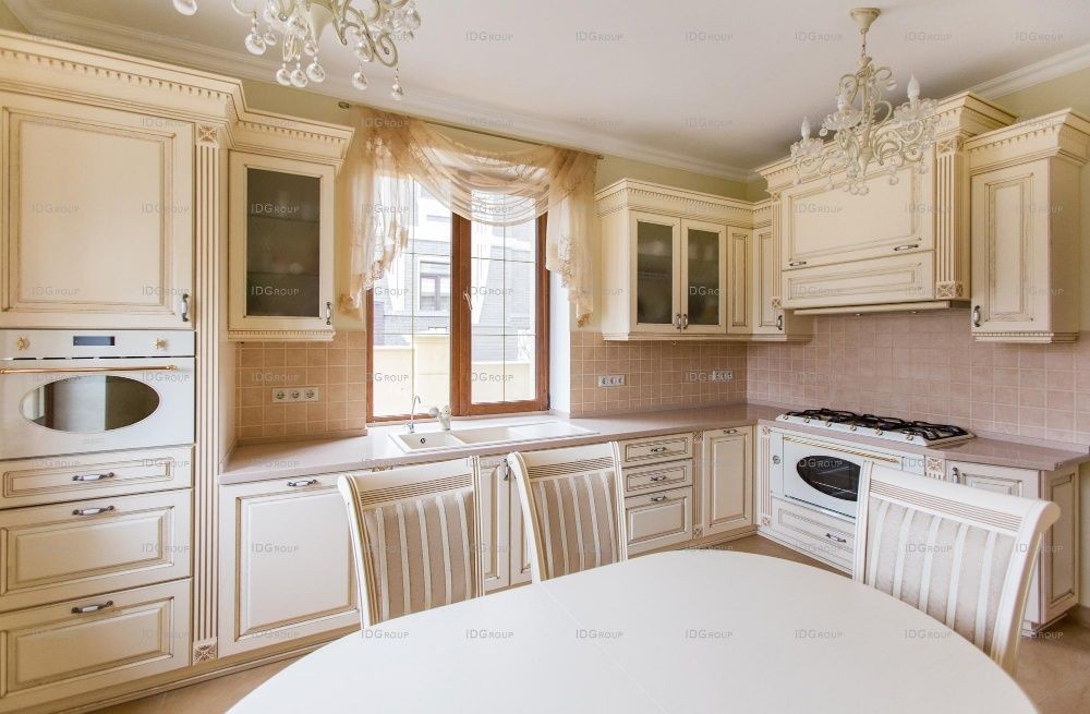 Зона кухни оформлена резной мебелью в ретро-стиле из массива дерева и дополнена удобной обеденной зоной. Центральным элементом парадной столовой, безусловно, является обеденная группа, составленная из деревянного резного стола с мощным основанием и классических стульев с мягкой обивкой.
