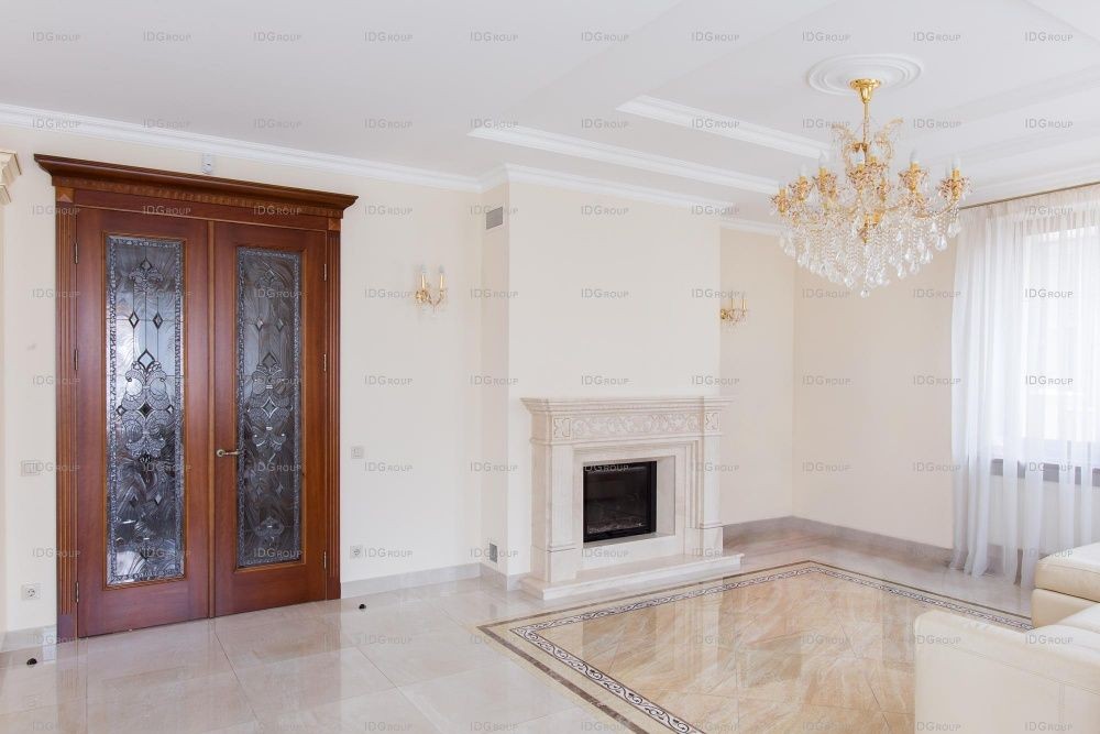 Интерьер приближен к современной классике, которая соединяет в себе изящество прошлого века и невероятный комфорт нынешнего. Природные пастельные оттенки, использованные при оформлении комнат, создают невероятно уютную и домашнюю атмосферу. Гостиная с мраморным камином непременно станет центром притяжения для всей семьи. Здесь приятно будет проводить вечера за неспешными беседами с бокалом вина.