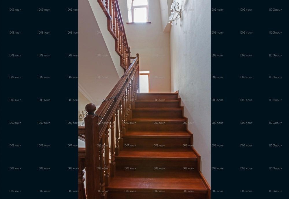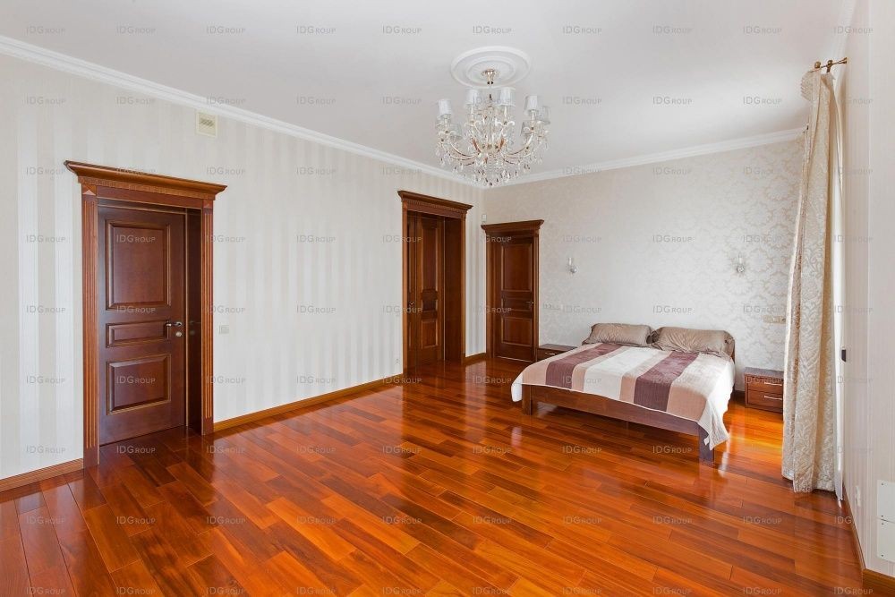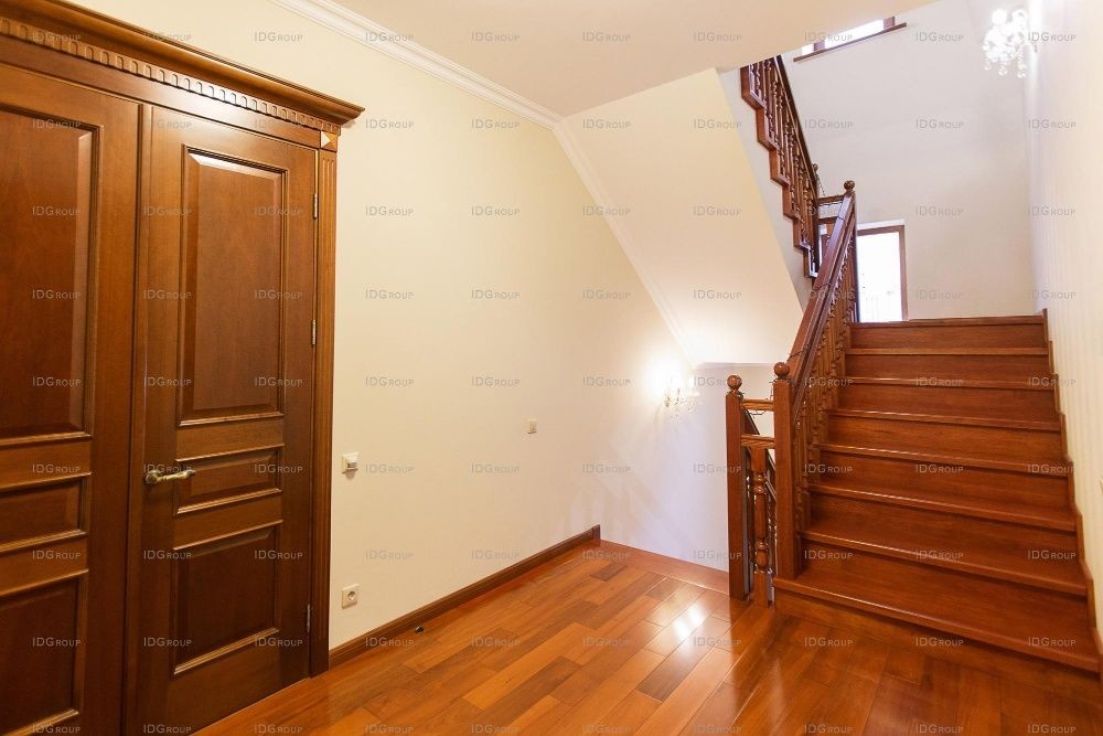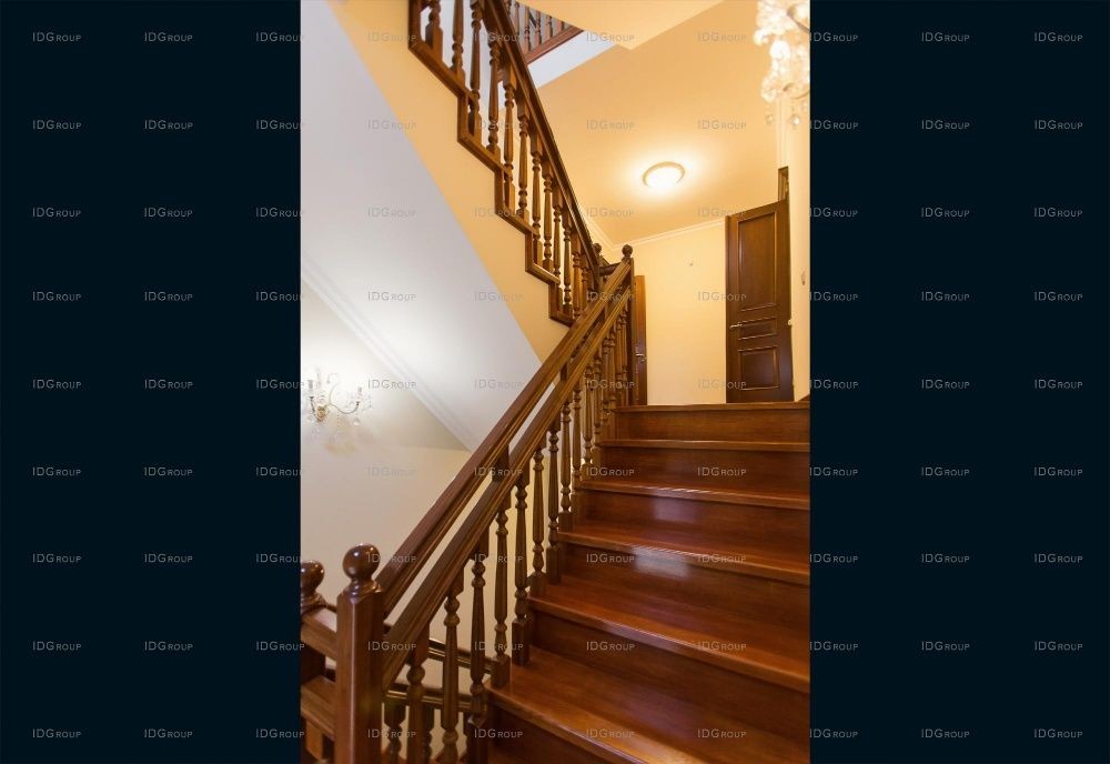 По роскошной деревянной лестнице, освещенной изящными настенными бра, мы направляемся на второй этаж. Здесь размещены 3 спальни, которые выполнены также в светлых тонах. Полы отделаны паркетом из бирманского тика. Шоколадные оттенки полов и дверей прекрасно контрастируют с основным декором. Размеры спален позволяют вместить небольшой будуар – уголок для чтения и бесед.