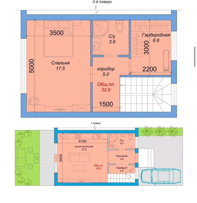 2-й этаж: спальня, санузел, гардероб.