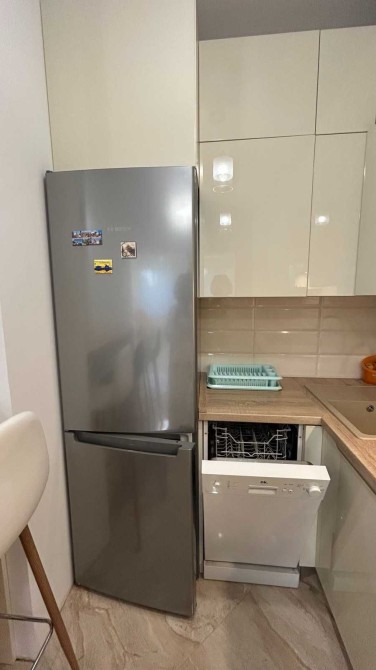 Велика кухня-студія з усією необхідною технікою: посудомийка, холодильник, мікрохвильова піч, чайник та посуд. І навіть телевізор для комфортних вечорів!