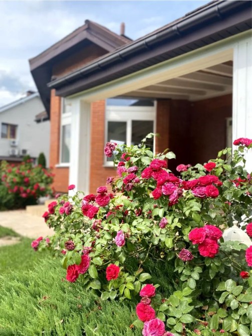 Будинок огороджений і територія зелена і доглянута. Кущі, квіти, садові дерева, фонтан, стежки, город , теплиця.. все має своє місце згідно ландшафтного дизайну. Встановлена автоматична система поливу з датчиками дощу, ливнева система .