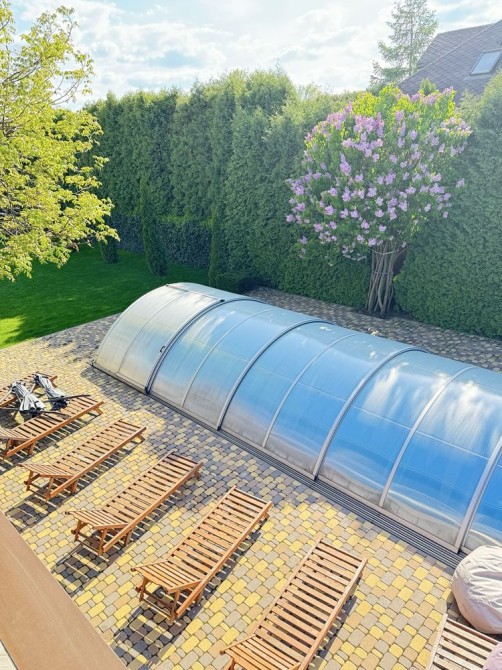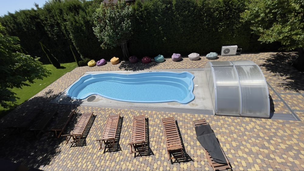 Басейн 10 на 3 метри з протитоком , можна плисти на місці . Закривається куполом. Працює з травня по вересень включно. Шезлонги біля басейну .