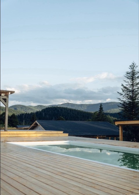 На території комплексу є велика тераса з басейном, звідки відкривається приголомшливий краєвид на карпатські дрімучі ліси.