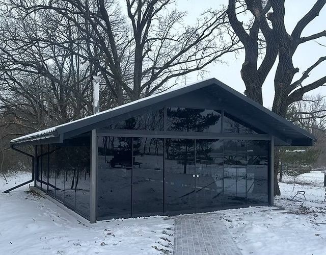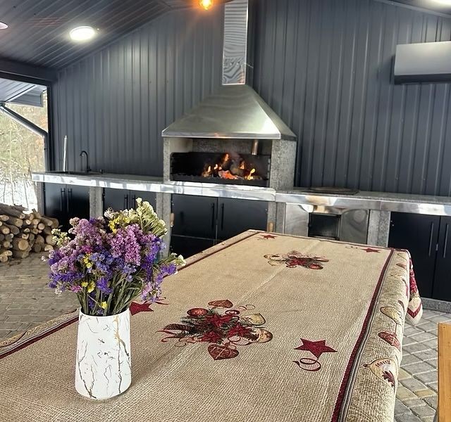 Також на території є комфортний скляний будиночок з мангалом, де ви можете відпочити з друзями зі смачними стравами на мангалі за великим столом!