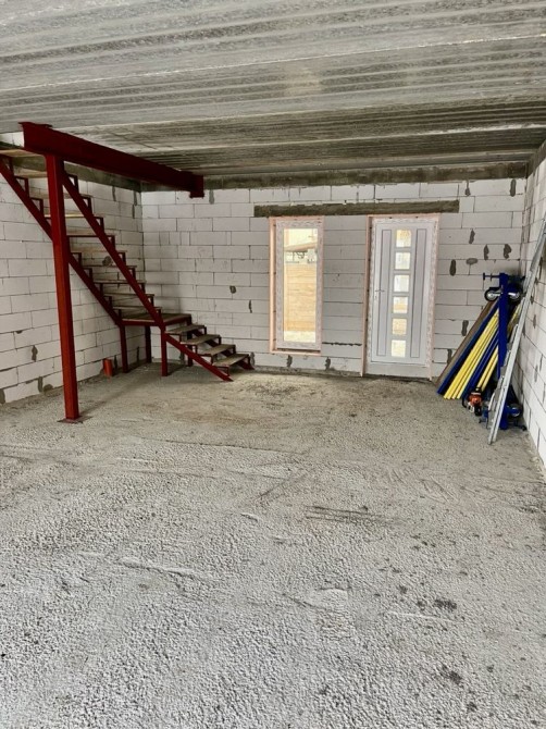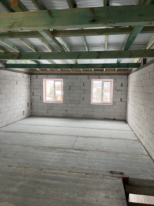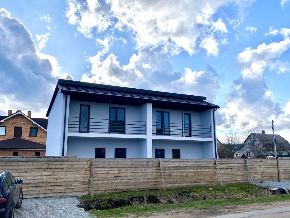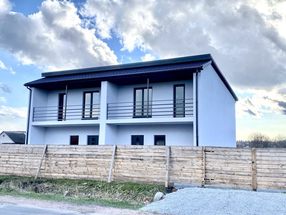 Сучасний 2-х поверховий будинок з газоблоків, одна секція має 107 кв м загальної площі, вільне планування кімнат, дах - металочерепиця, утеплення стін пінопластом 100 мм, м/п/вікна, без оздоблювальних робіт, світло 3 фази (день/ніч), газ поруч. Каналізація виконана частково- вмонтовані в землю 2 колодязі по 2 круга, висотою 2м.
