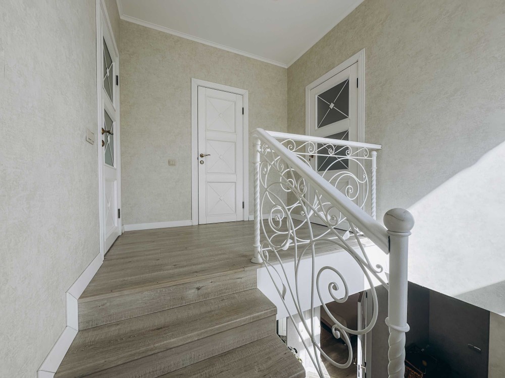 Сходи бетон, тепла підлога, сантехніка Grohe, велика тераса, сосни на ділянці.