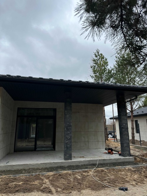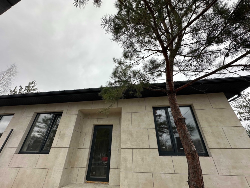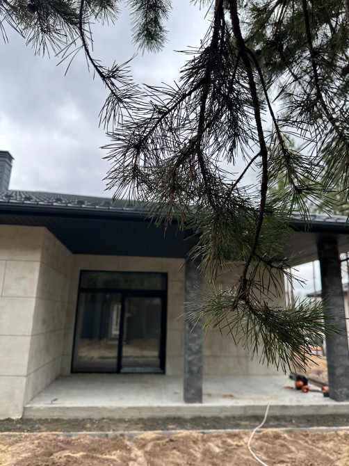 Будівництво: керамоблок 350 мм, утеплення пінополістиролом, фасад під травертин. Дах — металочерепиця, утеплення мінватою 200 мм, паро- та гідробар’єри. Паркан на фундаменті з якісного металопрофілю.