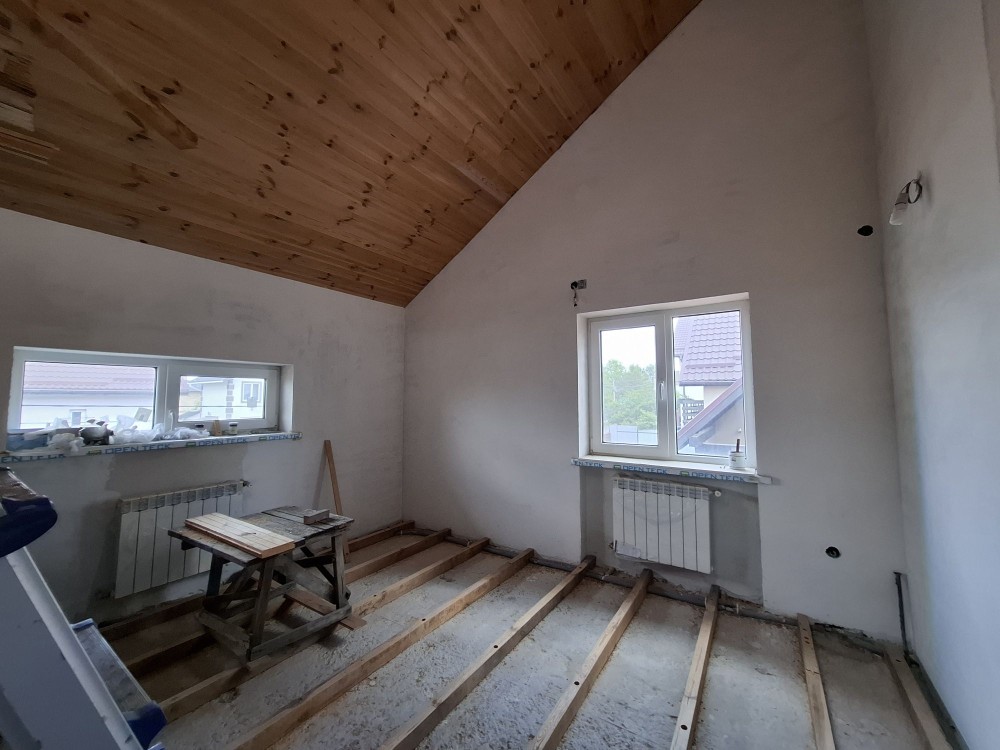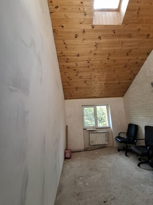 Другий поверх: санвузол, коридор і три кімнати- максимально зробленні роботи під поклейку/покраску, розведена електрика, виведені точки під сантехніку, розведене опалення- встановлені радіатори.
