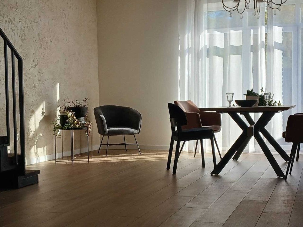 Ремонт виконаний у світлих приємних тонах, підлоги, під дерево, з/в плитка, піщаник,.