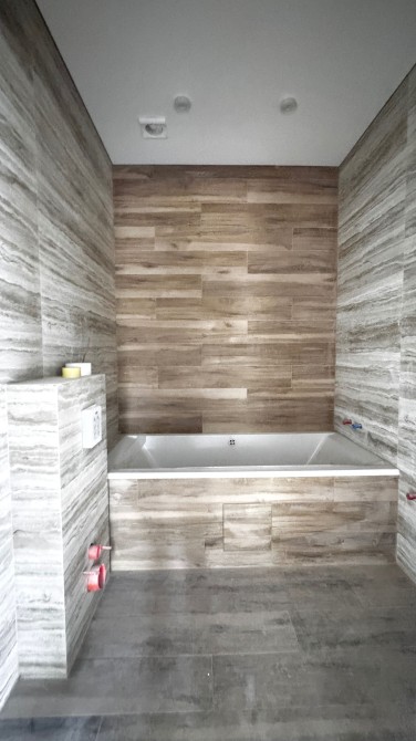 На першому поверсі та в санвузлах вже покладена плитка;