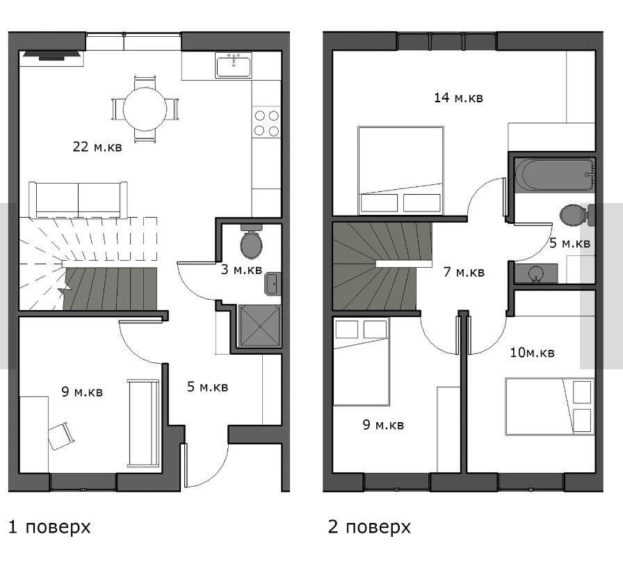Другий поверх: три окремі житлові кімнати та санвузол.