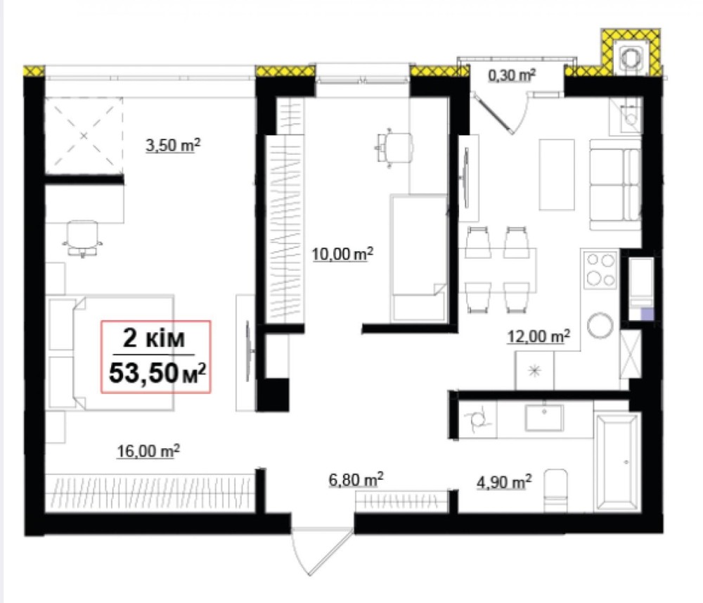 • Общая площадь 53.5 м2