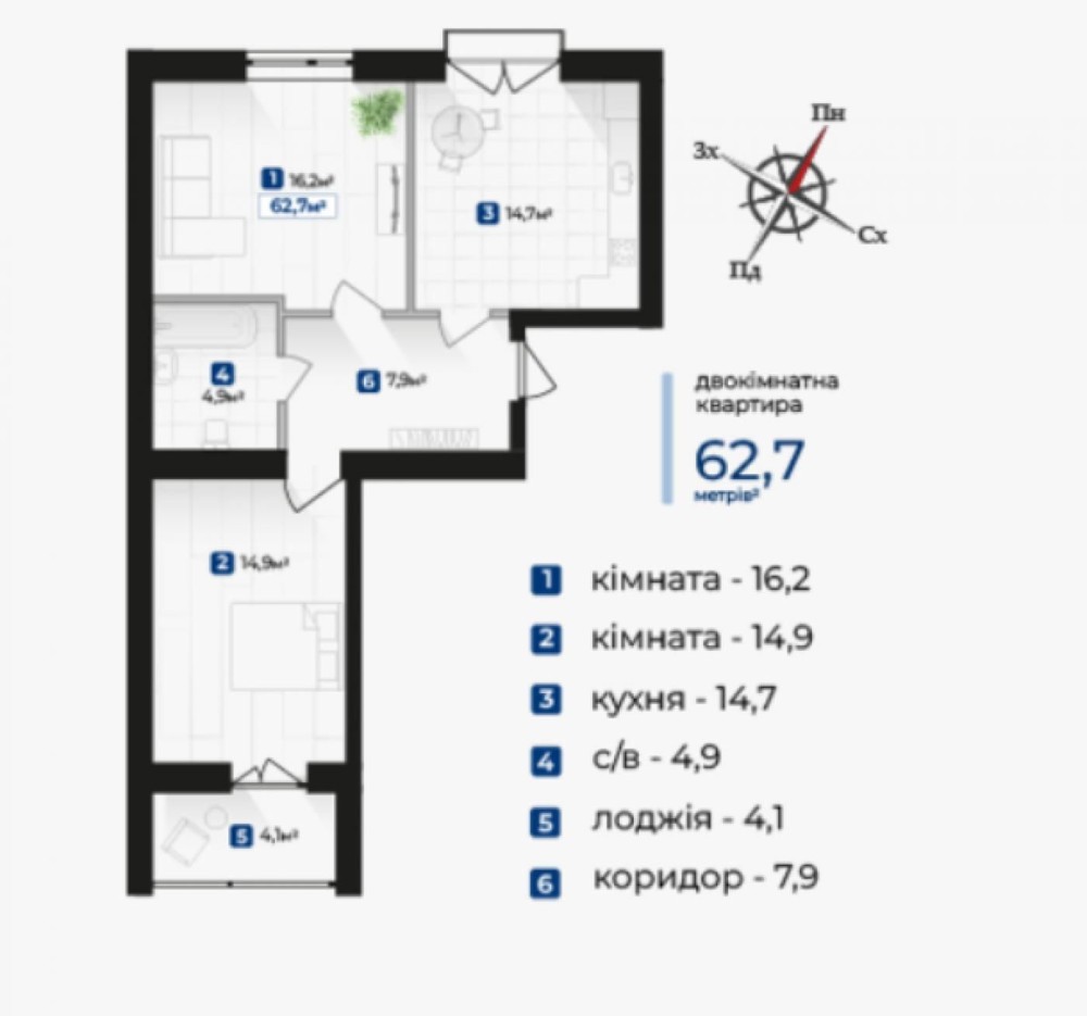 • Общая площадь 62 м2