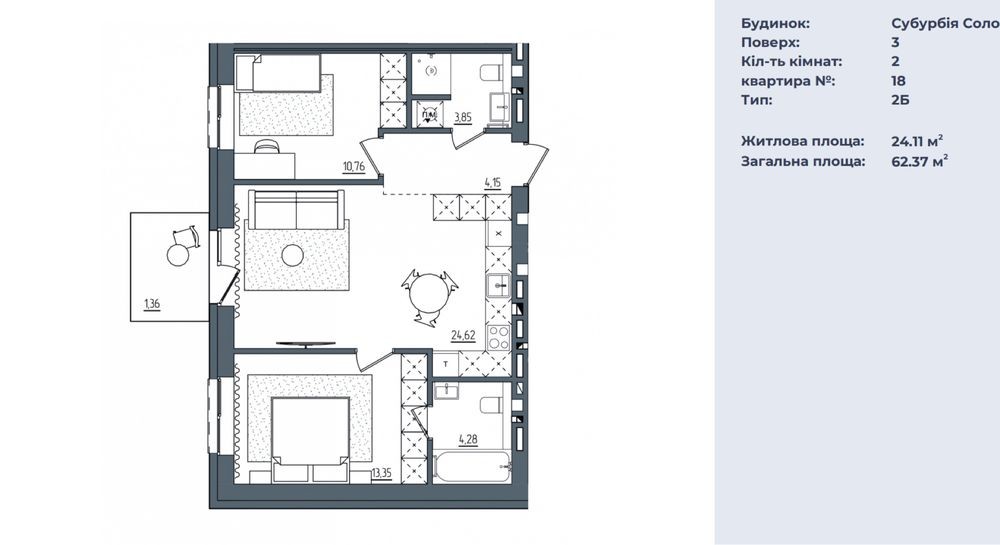 • Общая площадь 62.37 м2