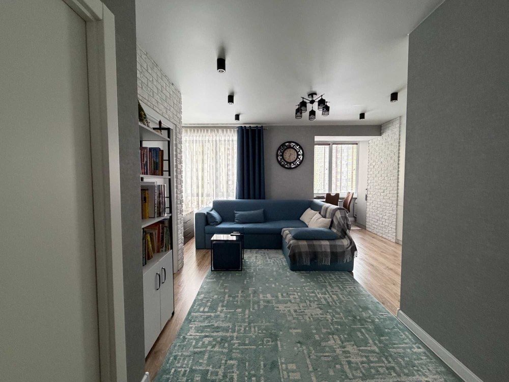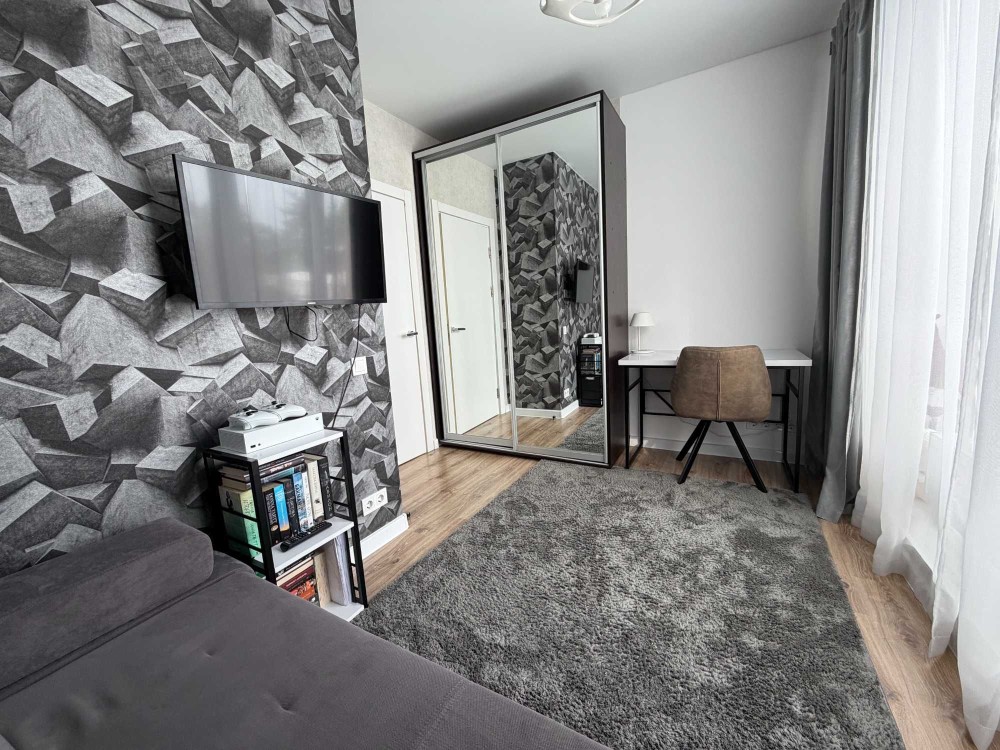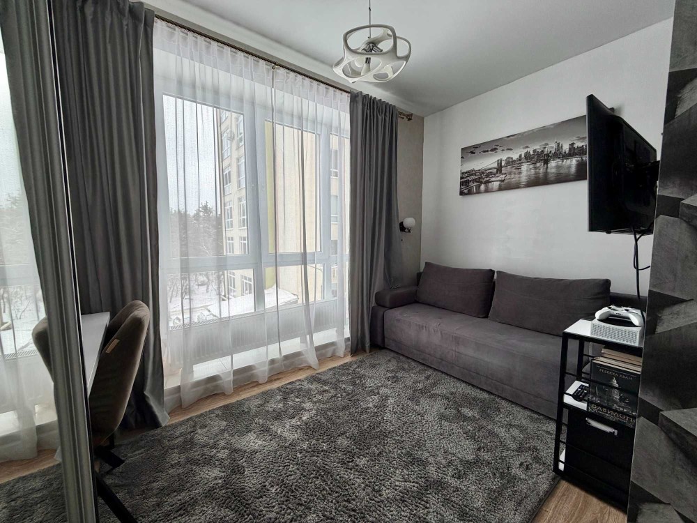 Квартира має функціональне зонування: дві окремі спальні та простора кухня-студія.