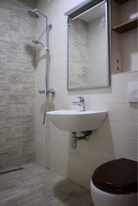 Велика кухня-вітальня, окрема спальня, ванна кімната з сучасною душовою системою та лоджія.