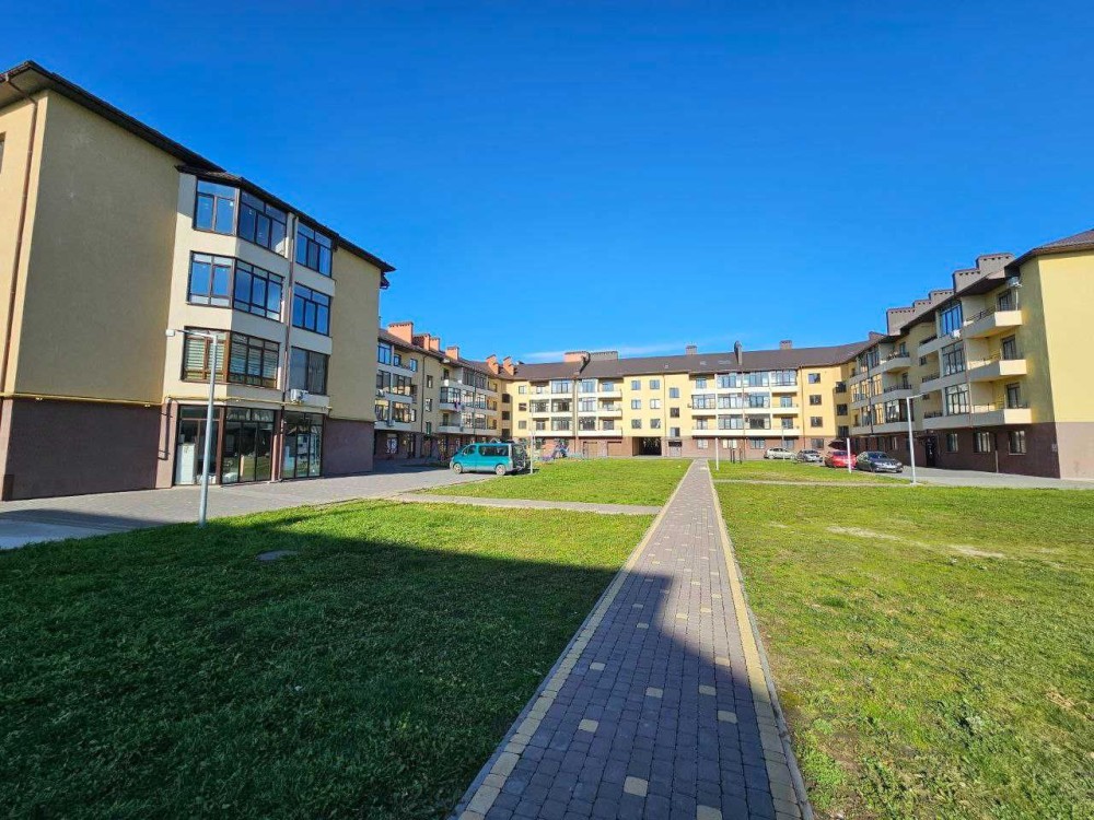Житло в новому житловому комплесі невеликої поверховості. Двір закритого типу з шлагбаумом.