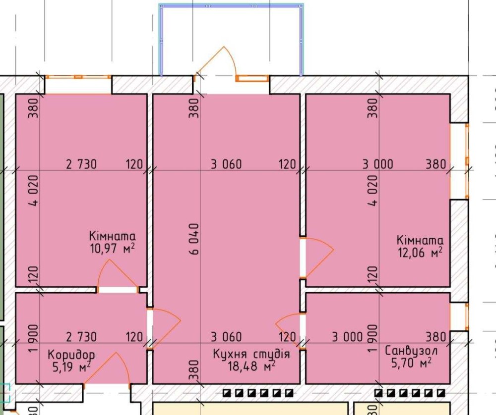Кухня - 18,5м², дві спальні 11 і 12м² відповідно, суміжний санвузол.