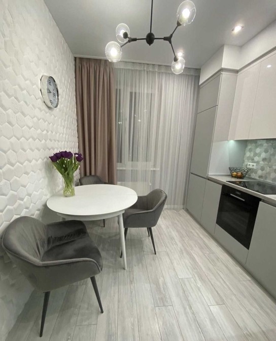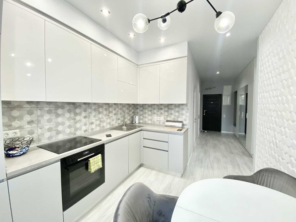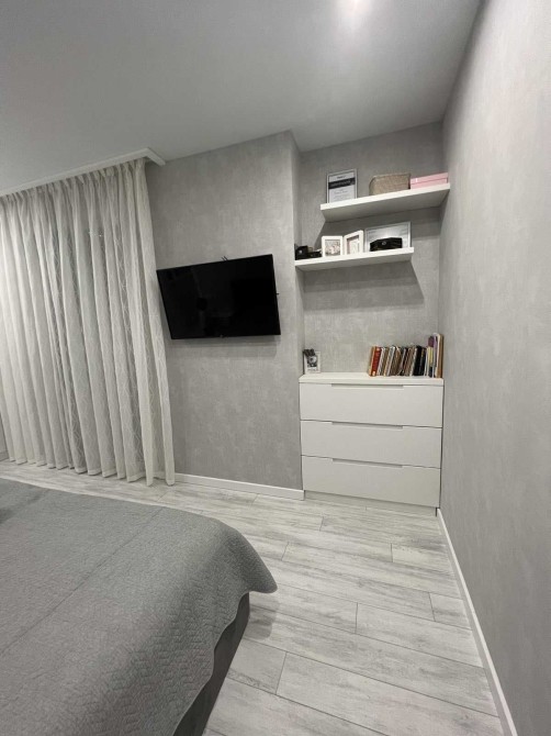 Выполнен ремонт из качественных материалов в светло-серых тонах.