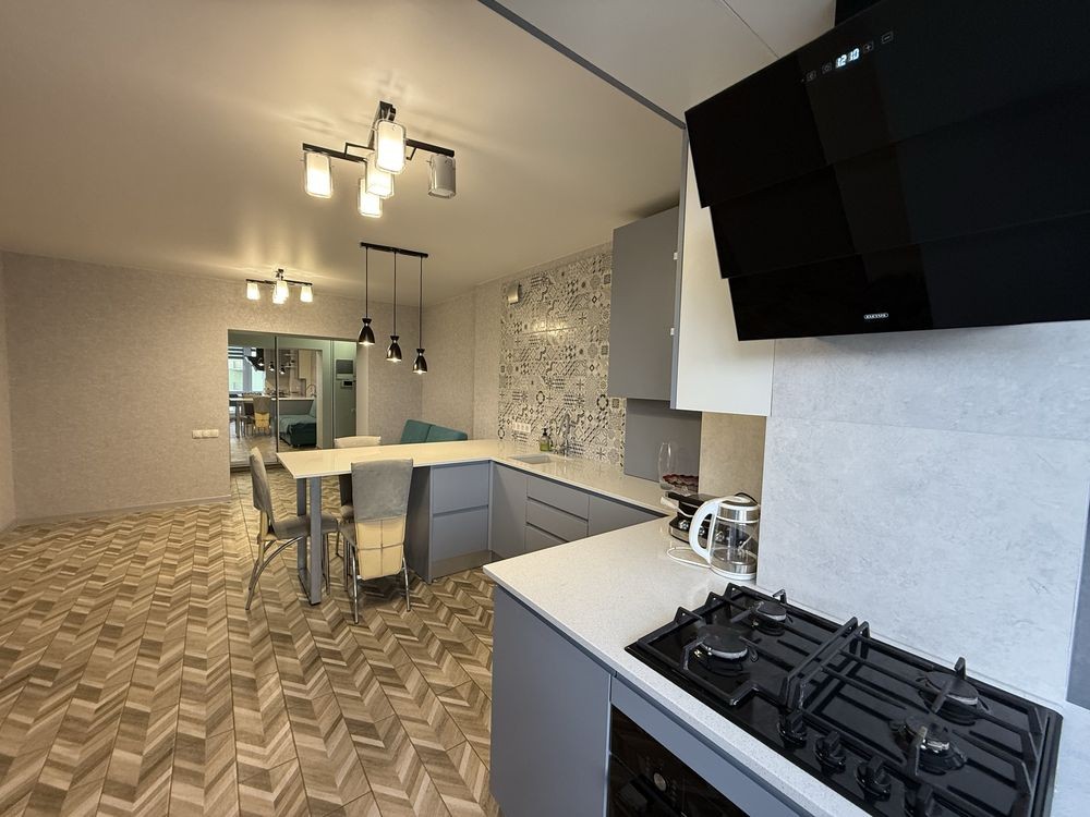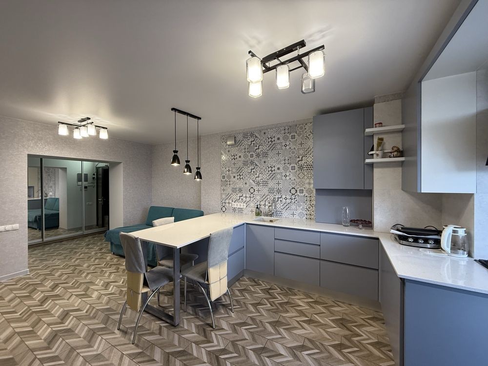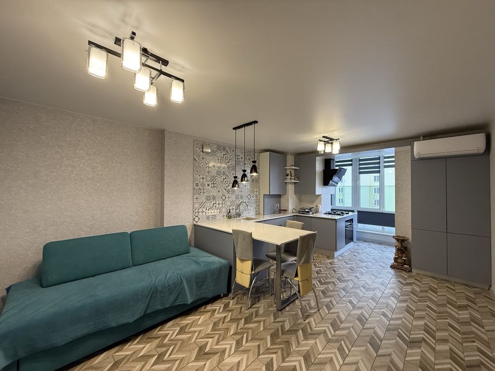Кухня студия и 2 отдельные комнаты (спальня и гостевая с балконом).