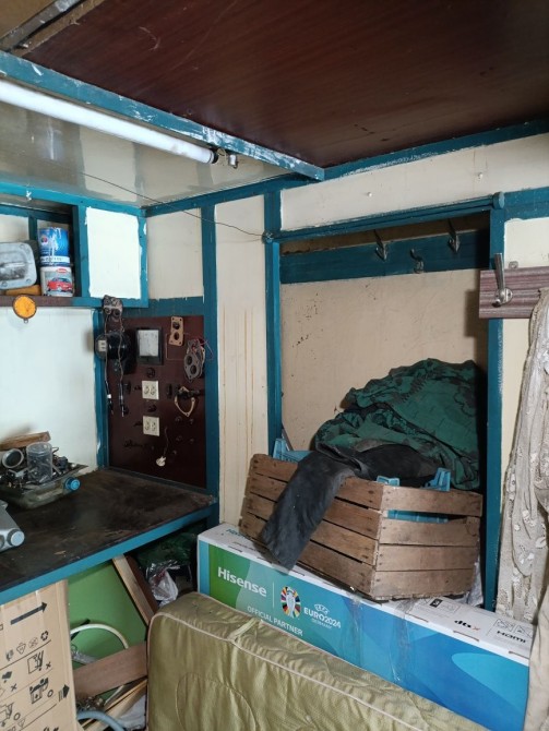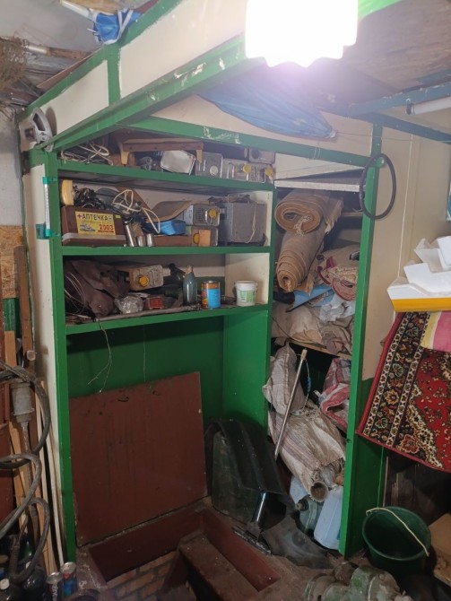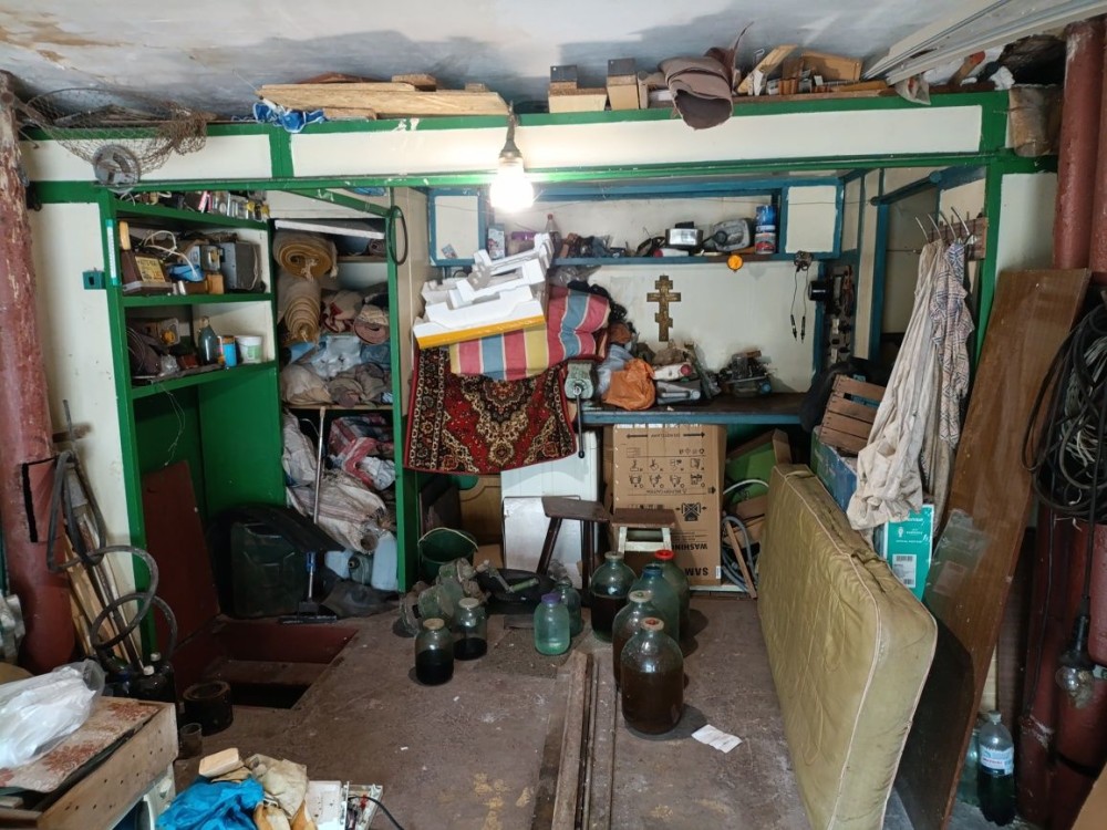 В гаражі є верстак, точильний станок, яма, компресор для підкачування коліс, буржуйка погріб та стелажі