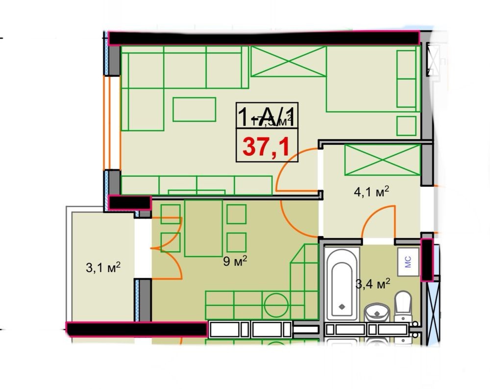 • Общая площадь 37.8 м2