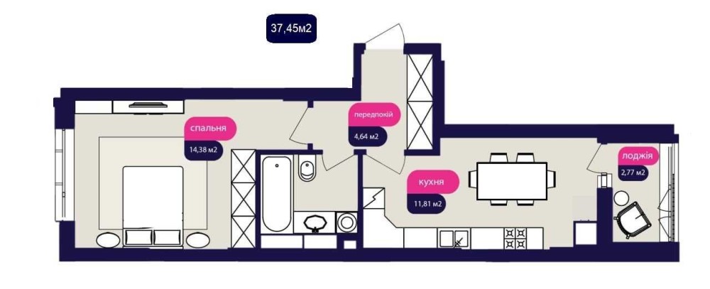 Компактний передпокій, спальня площею 14,3 м2, кухня з виходом на лоджію, можливість перепланування під будь-які потреби.