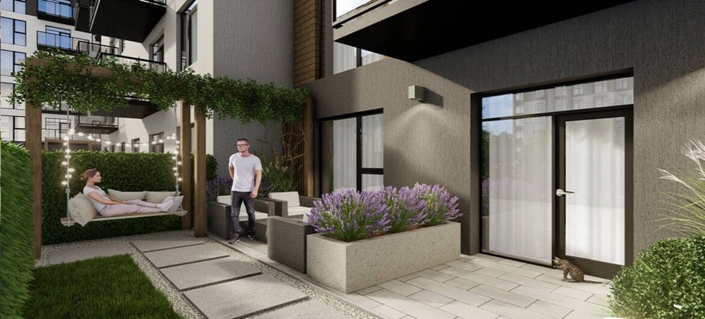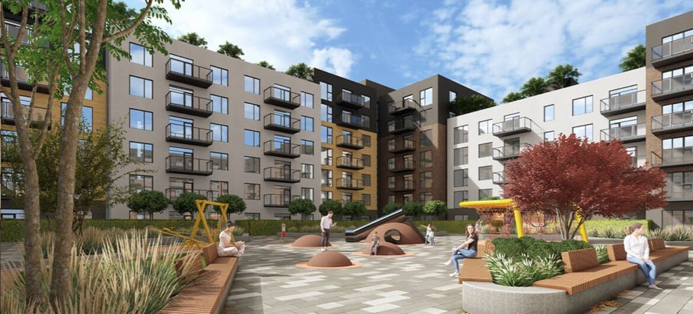 Двір із озелененням, дитячими майданчиками, зонами відпочинку та зайняття спортом.