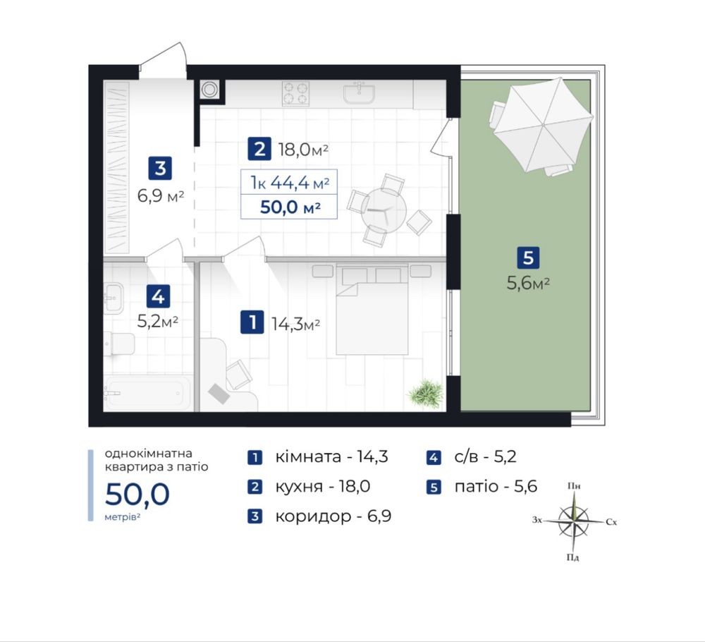 Готова 1 кім квартира із патіо.Центральна частина міста вул.Коновальця