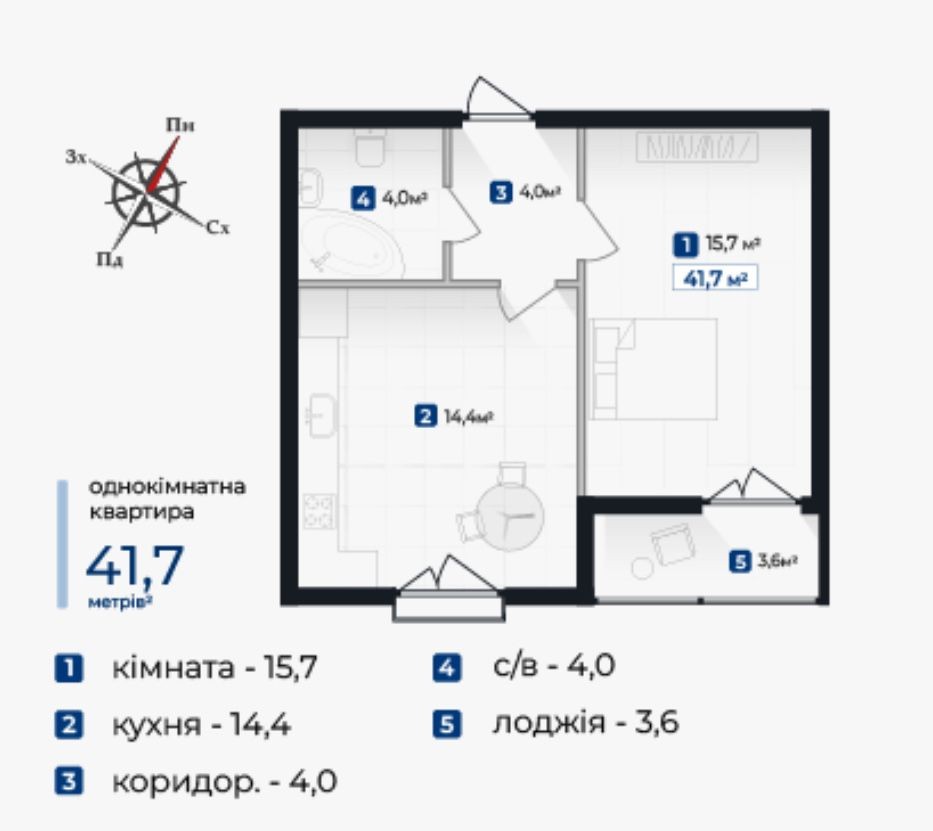 • Общая площадь 41.7 м2