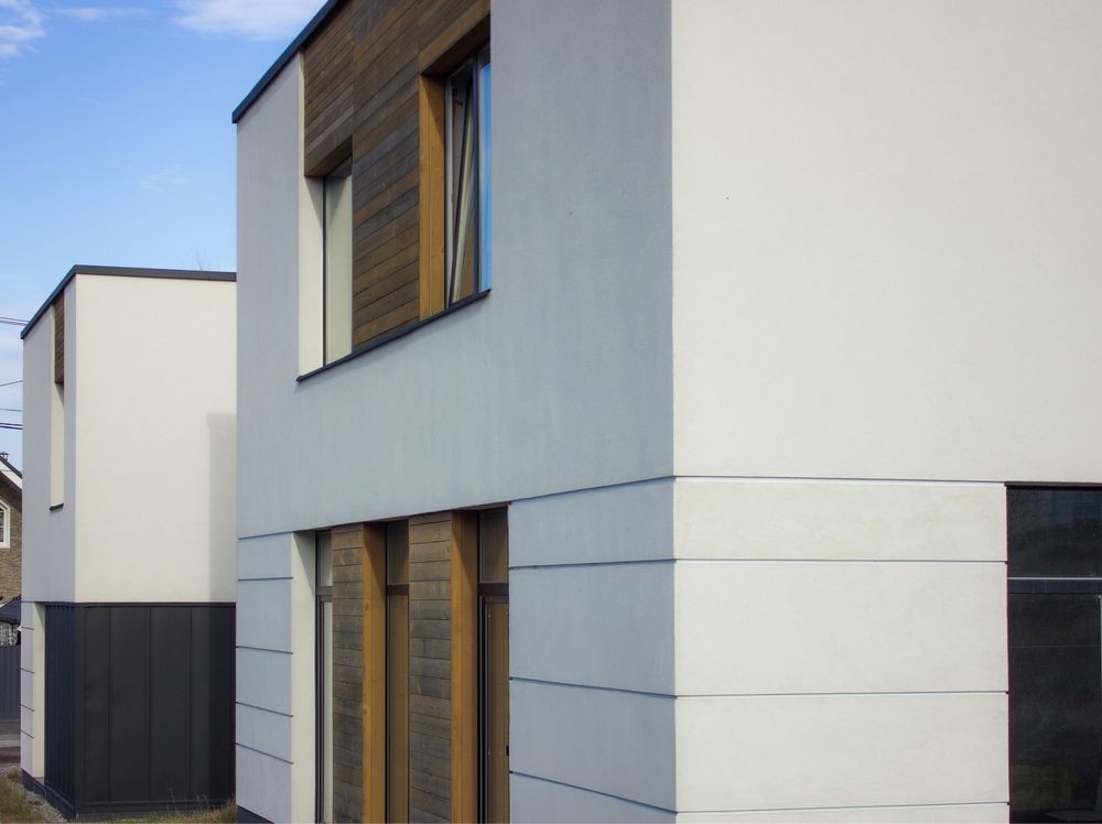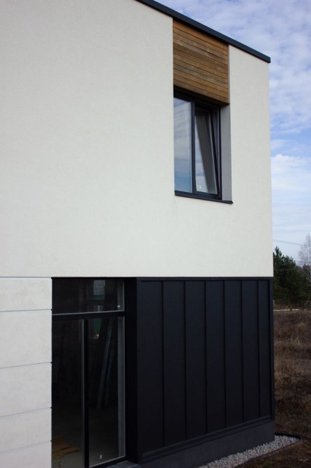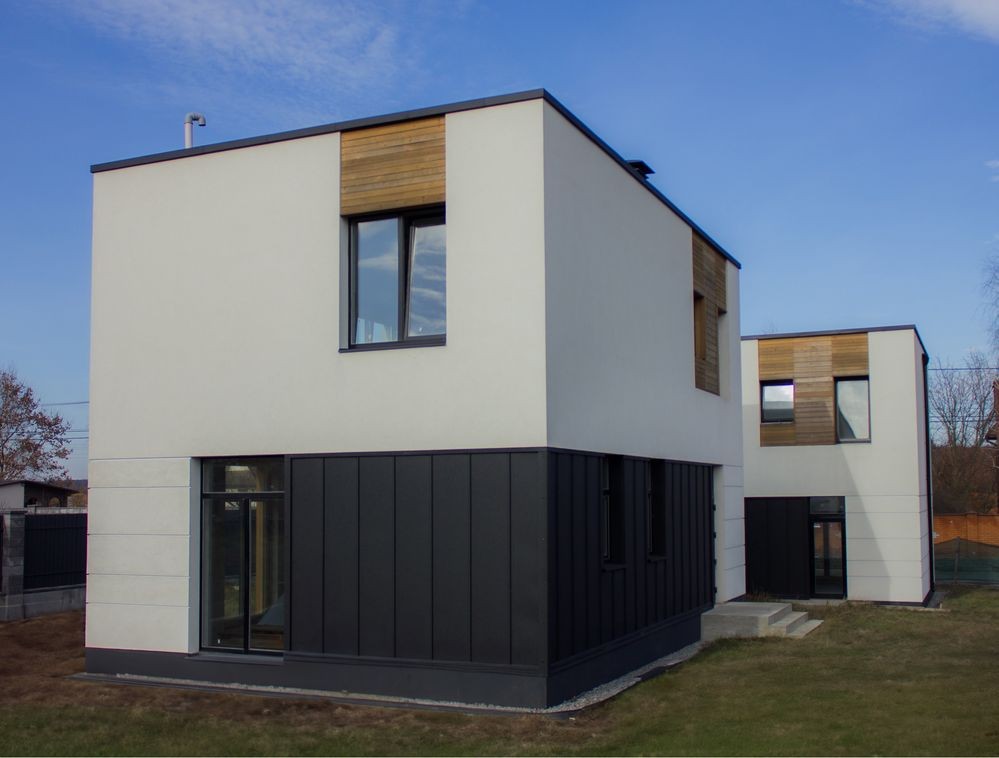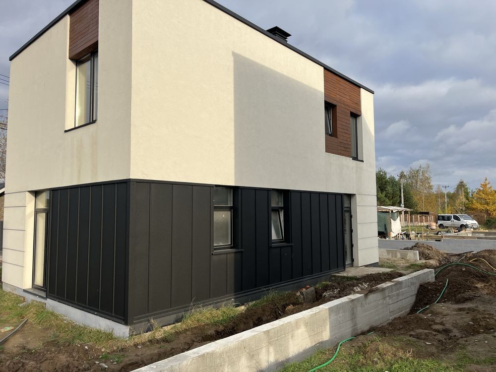 Стіни з блоку АЕРОК, утеплення Мінеральною ватою. Оздоблення фасаду: штукатурка, планкен та фальц.