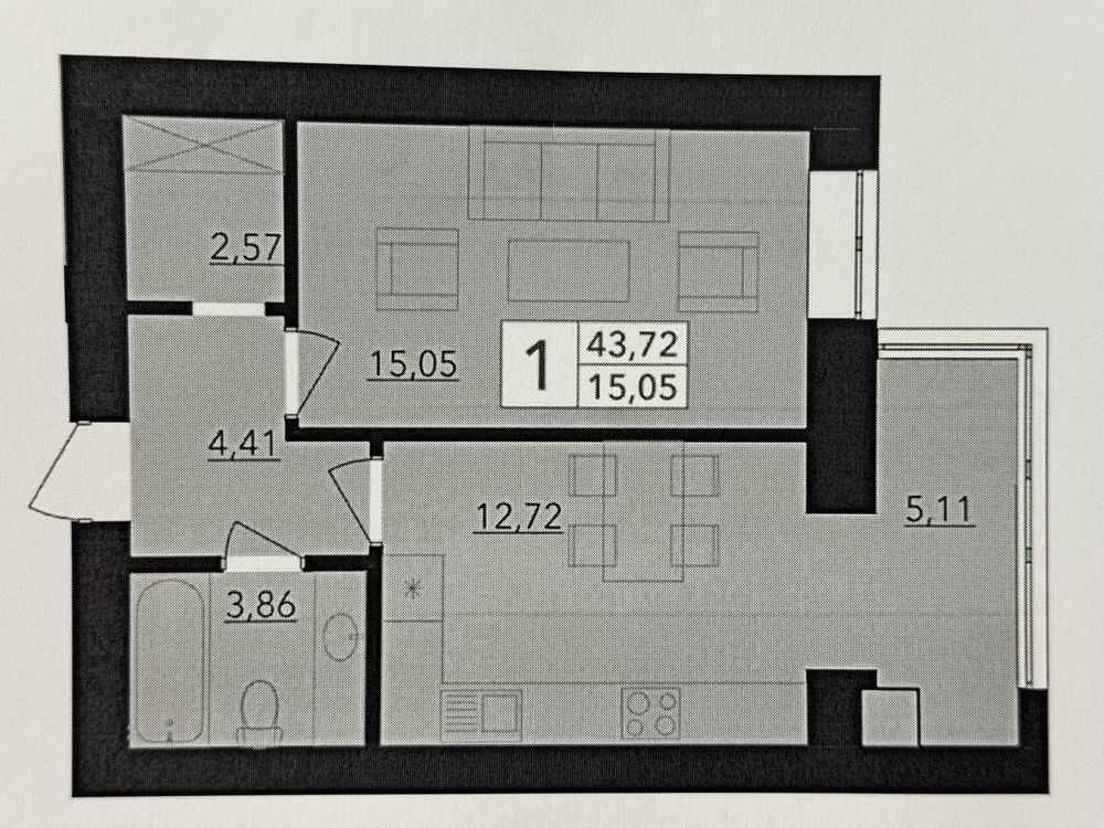 Світла та простора, не кутова (дуже тепла). Ідеальна база для втілення будь-якого дизайнерського проєкту.