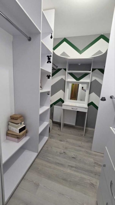 Велика гардеробна зі столиком для макіяжу додає зручності.