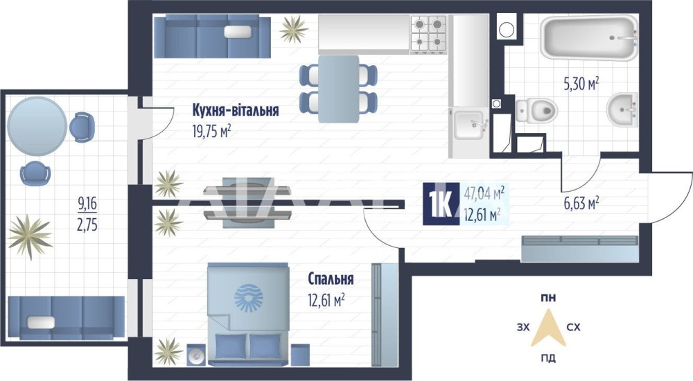 • Общая площадь 47.04 м2