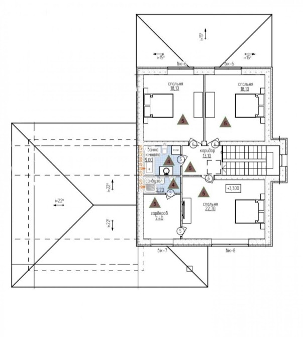 2-ий поверх: 2 спальні, 1 загальний санвузол + 1 спальня з гардеробом та санвузлом.