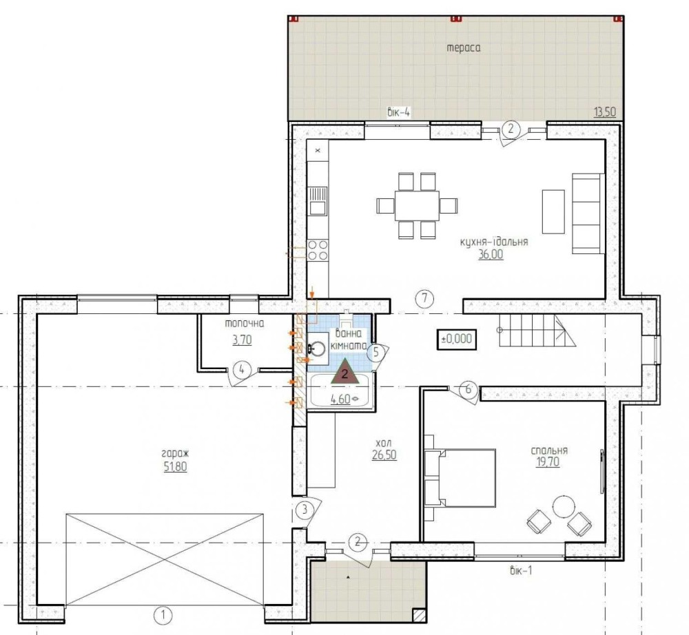 1-ий поверх: велика кухня-вітальня 36 кв.м., гостьова спальня, хол, санвузол, холодний коридор, гараж на 2 авто (є вихід з будинку), топкова.