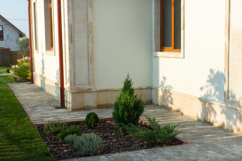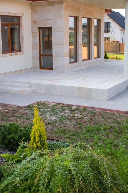 Виконано із застосуванням екологічно чистого каменю (піщаник) з елементами декоративної штукатурки.