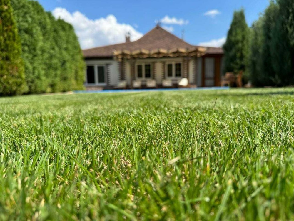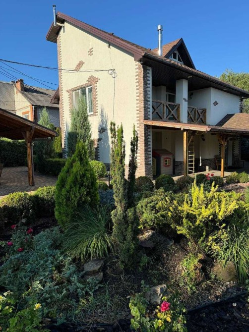 Шикарна прибудинкова територія. Ландшафтний дизайн із зеленими насадженнями та газоном. Зона відпочинку басейном, альтанкою та мангалом, а також є сауна на дровах та бильярдной.